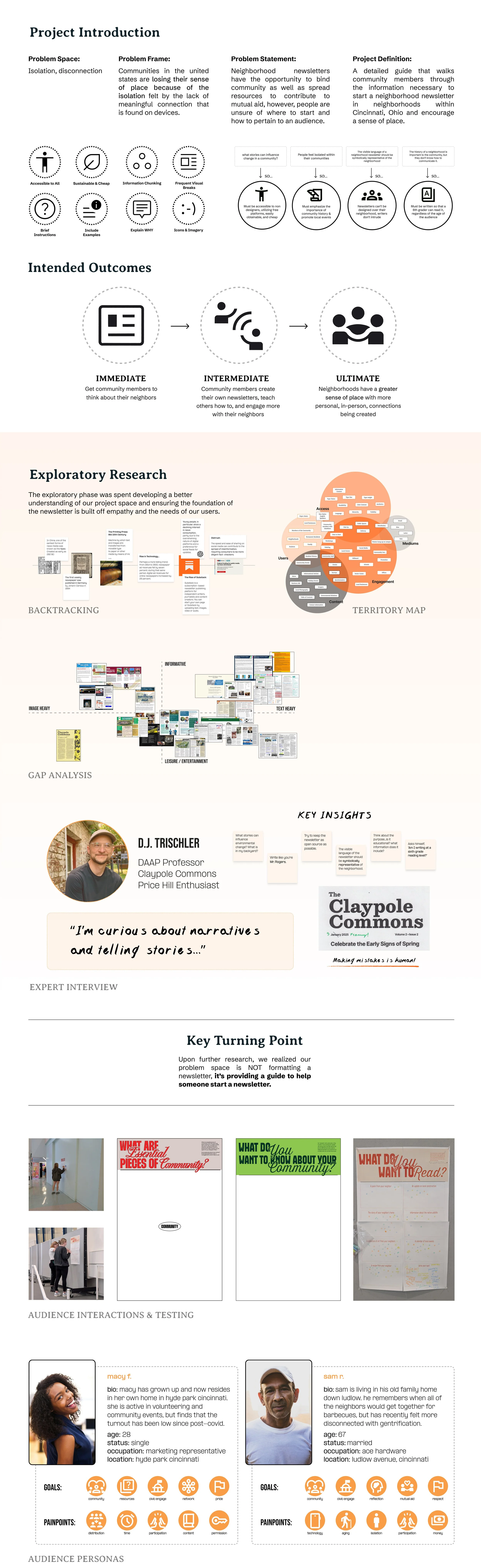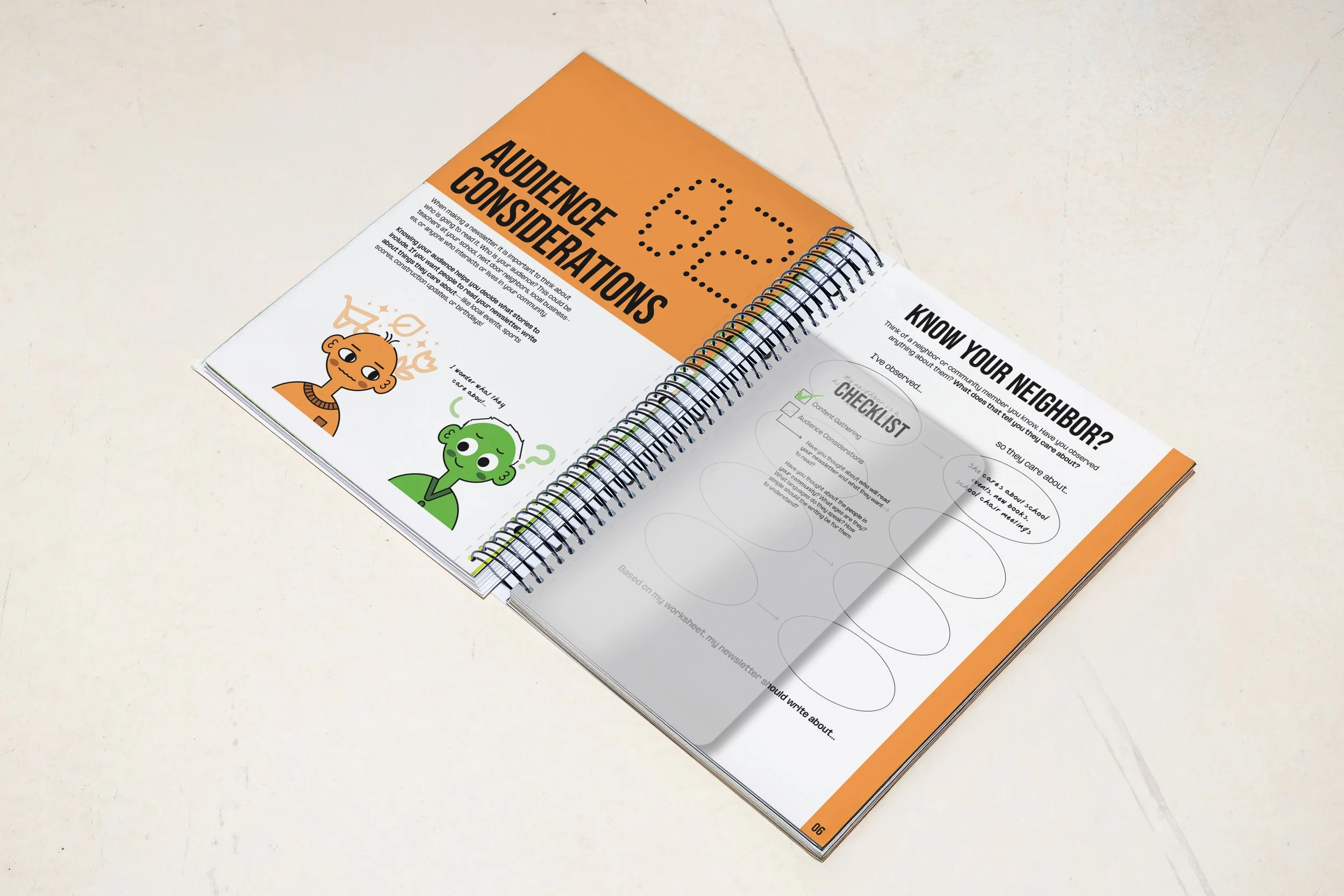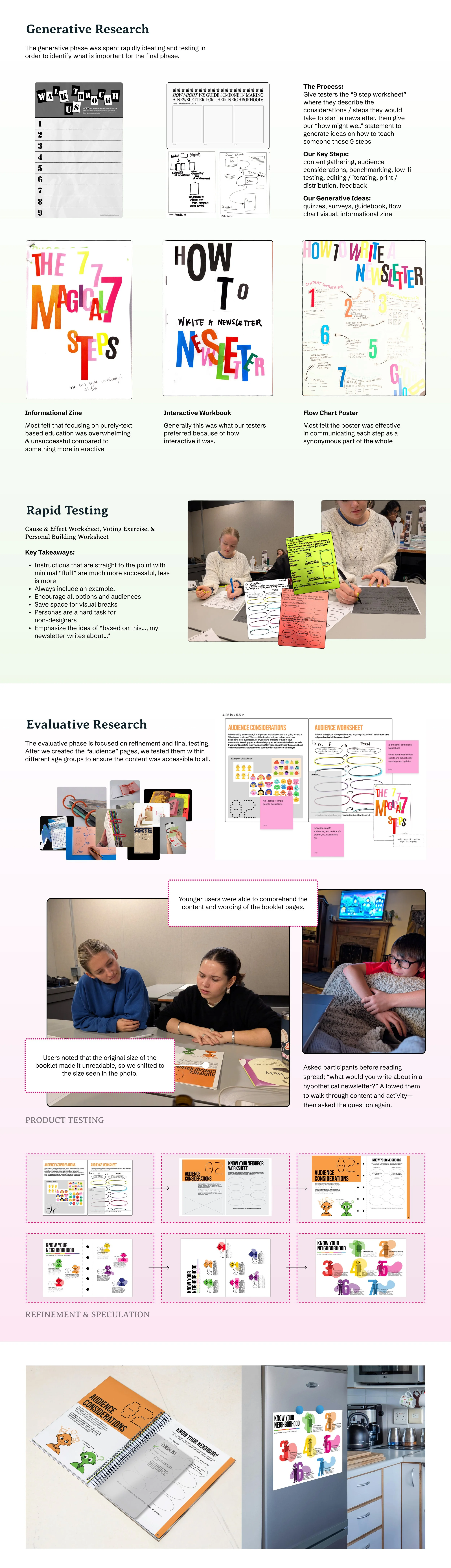 We identified neighborhood newsletters as a powerful vehicle for rebuilding community and promoting cultural equity. Rather than producing a newsletter ourselves, we created a comprehensive, approachable guide that empowers residents to create their own. The fold-out poster and interactive “Know Your Neighbor?” activity walk users through the steps needed to start a newsletter while encouraging them to shift perspective from self-focused thinking to the needs and interests of their neighbors. Through 1:1 and focus group testing, users moved from statements like “I care about [blank], so I would write about [blank]” to “My neighbor cares about [blank], so I would write about [blank],” demonstrating a measurable shift in empathy and mindset.